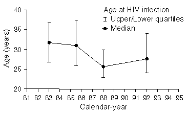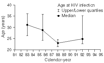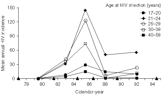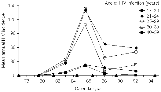 Results: The median age at HIV infection was estimated to have decreased from 31 years of age between 1982 and 1984 to between 23 and 27 years in the periods 1987 to 1989 and 1990 to 1994. Despite the trend to a younger median age at HIV infection during the current epidemic, HIV incidence was estimated to have declined in all age groups from a peak in the mid-1980s. This decline was more pronounced in the older age groups, with more modest reductions in age groups under 30 years.