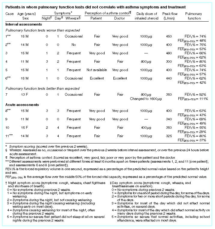 At interval assessments in which management had not been changed and the results of pulmonary function tests were low, three of five adolescents (Table: assessments 1, 3-6) reported frequent wheeze. The other two thought their asthma was well controlled; however, their FEF 25%-75% values were 62% and 42%, respectively. In these patients peak flows, measured at home and by spirometry, were all above 300 L/min and this may have accounted for ALIGN=TOP the reluctance to change therapy. However, it has been shown previously that peak flow results can be misleading, and widely varying optimal values can be expected. 3 A low expectation of what can be achieved in frequently symptomatic patients may contribute to a less aggressive approach in adolescents with asthma.