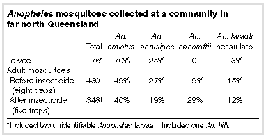 In February 1996, vivax malaria was diagnosed in a man from a remote community in far north Queensland who had not visited a malarious area for the past 19 years. Microscopy and DNA studies of blood from other residents of the community did not identify a source of infection. It was suspected the infection was transmitted by mosquitoes from a neighbour who had been infected in Papua New Guinea, but whose blood was not available for DNA tests.