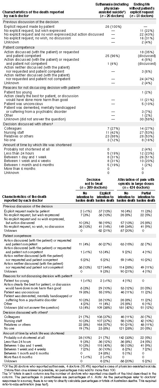 An estimated 24.7% (±3.1%) of all Australian deaths involved a decision not to treat with the explicit intention of not prolonging life or of hastening death. Of these, less than one-tenth (or 2.2% of all Australian deaths) were in response to an explicit request from the patient, and in most cases (22.5% of all Australian deaths) there was no explicit request from the patient. In 3.2% of all deaths, the doctor believed that the patient had expressed a wish for death to be hastened, but there had been no discussion with the patient, and in 5% respondents did not indicate whether the patient was involved in the decision.