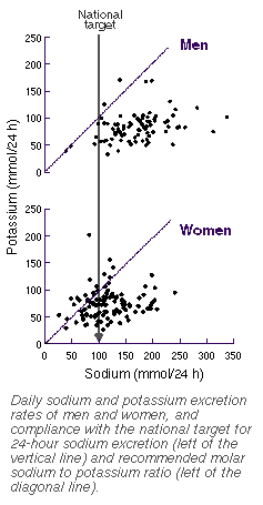 The effect of low dietary potassium on health has received less attention, but there is good evidence that potassium intake should at least equal sodium intake in molar units.8,9 Potassium predominates in unsalted foods because it is the major intracellular cation in the living tissues of both plants and animals. Thus, virtually all the natural foods available to mammals have a molar sodium to potassium ratio of less than 1.0. The human body must have evolved on this dietary ratio; its inversion is recent in phylogenetic terms, unnecessary and probably unsafe.8,9 Published data on current intakes of sodium and potassium among Australians are very few, and usually based on small samples10-12 We report electrolyte excretion data obtained from 194 Hobart residents for a behavioural study in 1995. Our estimates are based on 24-hour excretion of these electrolytes in the urine (widely accepted as the preferred method of assessment of intake).13,14 |
