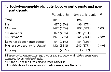 Box 1 (below) compares sociodemographic characteristics for these 194 participants with those of the other 425 people originally selected. The two groups had a similar sex distribution, but participants were significantly older and had higher socioeconomic status. For participants, the sex ratio was similar in both age divisions (43% men in the 18-44 years group and 46% men in the 45-70 years group), and in both socioeconomic groups (47% and 44% men in the lower and higher socioeconomic status groups, respectively). While we do not have birthplace data for the non-participants, most participants were born in Australia (83%) or in the United Kingdom or Ireland (12%). |