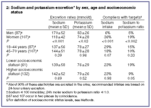 The mean potassium intake in men was 9 mmol higher than in women (P = 0.03), but differences between age groups and socioeconomic