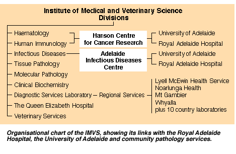 In July 1982, a new Act (with a new Council) defined and strengthened the relationships of the IMVS with the RAH and the University of Adelaide, allowing it to concentrate on the mainstream areas of medical pathology and their application to research, teaching and service. In 1986, an internal report (Review of Research) on the IMVS/RAH campus by Professors David Penington and Gustav Fraenkel outlined a framework for the development of research. The integration of service, teaching and research with the outcome of high quality care provided by clinicians actively engaged in research was endorsed in the report, but they also suggested the creation of separate basic science laboratories to support research and avoid disparate but duplicated facilities on the campus. They recommended that this development should be part of the IMVS/RAH campus because the benefits of a separate research centre would be diminished by the separation of research activities from service functions. The IMVS and RAH accepted the challenge, and by 1990 funds had been raised and the Hanson Centre (now the Hanson Centre for Cancer Research) had been established. Over the past decade, the IMVS has organised itself along business lines and become reliant on its ability to provide high quality patient services, attract grants and contract for service and research. About 80% of its $55 million expenditure annually is derived from contracts or grants (for public and private pathology services on a fee-for-service basis); the remaining 20% is derived from direct grants from the South Australian Government for statewide or specific pathology services. Therefore, the IMVS differs from pure research institutes that rely on government grants, research grants and donations. While this adds a complexity to its management, it is also a strength, ensuring that the IMVS remains competitive, efficient and relevant to the services for which it contracts. The strength of the IMVS is its collocation on the RAH and University of Adelaide medical school campus. This allows easy collaboration, integration and coordination with both the hospital and University, which has a symbiotic effect on achievement. This integration between hospital, university, service and research is exemplified by the organisational structure of the IMVS. |