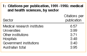The most notable feature of this Figure is that Australia's share of publications in SCI medical journals increased by 25% between 1986 and 1995. The average RCI for the whole period was 1, indicating that Australian publications are attracting appropriate notice. Australia's RCI has not changed significantly over time, but remained at or marginally above 1. This is a strong performance as citation rates are influenced principally by publications from the major research centres of America and Europe. Where is Australia's most "visible" medical research being conducted?A standard measure used to compare the visibility of research in different sectors is the average number of citations received per publication (cpp). In Box 1 (below) we relate the number of publications produced by each sector in the period 1991-1995 to the number of citations those publications attracted in the same period. The leading position of the institutes making up the AAMRI is consistent with Richard Smith's impression of Australia's research institutes.7