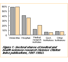 We also code the sector -- universities, hospitals, medical research institutes, government institutions, and "other" -- of each address. The medical research institutes sector comprises the 25 members of the Australian Association of Medical Research Institutes (AAMRI). Medical research in the Government sector comes primarily from the Commonwealth Scientific and Industrial Research Organisation (CSIRO) and the State and Federal departments of health. The "other" sector includes industry and non-profit organisations. We acknowledge "grey areas" at the margins of these assignments to sectors. For example, where a research group based in a hospital with a university connection lists the university in the address, we consistently assign the publication to the university. Another example is the John Curtin School of Medical Research (JCSMR), a full-time medical research institute (though not a member of AAMRI), which is also a research school of the ANU funded from that university's operating grant. Its publications are assigned to the ANU and hence fall within the universities sector. Most publications can be unambiguously assigned, but some addresses are not precise guides to the source where the research was conducted. This arises particularly for researchers who hold conjoint or adjunct appointments in two institutions. If such an author nominates a single institution, we accept that this is the location of the research leading to that publication. If an author specifies two separate addresses, two records are created for that publication showing the two institutions (double-counting created by this procedure is removed for sectoral and national analysis, but remains when the individual institution is the focus of the analysis). If the address itself has multiple components, the publication can not be split into multiple records and has to be assigned to the apparent primary institution. Very few publications fall into this latter category, and their existence has little effect on the map of national, sectoral or institutional sites of research. We have used the standard bibliometric practice of ascribing an article to a particular field of research on the basis of the classification of the journal in which it appears. This procedure is not without problems, particularly in the case of analysis at the subfield level, but experience from our other studies has shown that the results are accurate if the data are being used to map research in a large field.3 To what extent is Australian basic research in the medical and health sciences covered by the REPP database?In this field, at least 70% of published research output from universities and medical research institutes is in the form of journal articles, and, of these, at least 70% appear in SCI journals.4,5 We therefore estimate that, as a minimum, the REPP database covers 50% of the published output in these two sectors. SCI coverage of research from the sectors hospitals and government institutions may be less complete in terms of their total research output, but their contributions to basic research will be well represented.In this article, we are using the REPP database to answer questions about the map of medical research in Australia, concentrating primarily on publications from 1990 onwards, but also introducing some time-series analysis. Where is the research being conducted?The sectoral distribution (Figure 1) shows that the bulk of Australia's basic medical research is located in universities and hospitals. Most of the research articles from the universities sector (75%) come from the 10 teaching medical schools and the JCSMR at the ANU.