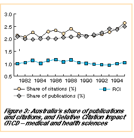 Figure 2 shows how the type of authorship of medical research articles has changed in the past 15 years. The two authorship types showing marked decline are "single author" articles, and "group" articles. Medical and health sciences in Australia appeared slow to exhibit the "internationalisation" of research apparent in other fields since the early 1980s, but the period since 1987 has seen a dramatic change. The proportion of publications involving international collaboration nearly doubled between 1987 and 1995. Collaboration with other Australian institutions has also become more common, increasing from 19% to 26% over the 15-year period. (A detailed analysis of Australia's international collaboration in basic research may be found in a monograph we prepared for the Australian Research Council.6 ) How "visible" is Australian medical research?We assess "visibility" by the number of research articles published and the citations those articles receive. Figure 3 plots Australia's share of "world" publications (i.e., of the total in the SCI) in the medical and health sciences and its share of all citations in SCI journals. The chart also plots Australia's Relative Citation Impact (RCI), which is calculated by dividing its share of "world" citations by its share of "world" publications.