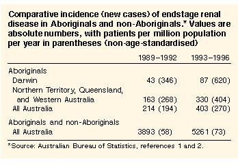 The continued alarming rise in incidence of renal failure in Australian Aboriginals living in the Top End of the Northern Territory (NT) is documented in this issue of the Journal by Spencer and coworkers1 from the Royal Darwin Hospital and the Menzies Institute of Health Research. Are their findings an isolated observation, why is it happening, and what should be done to address the problem? The numbers are real. The Darwin incidence and prevalence figures for endstage renal disease (ESRD) in Aboriginals are entirely consistent with figures from other Aboriginal community surveys of the Kimberley, Pilbara and Goldfields regions of Western Australia (WA). The WA Health Services Research Linked Database shows that in the past 8 years there has been a yearly rise in (age-standardised) incidence of dialysis from 67 to 819 per million in Aboriginal men, and from 130 to 758 per million in Aboriginal women. The current rates are, respectively, 12-fold and 20-fold more than the non-Aboriginal rates (Ms K Brameld, Research Officer, Department of Public Health, University of Western Australia, personal communication). Whole-of-Australia incidence data recorded by the Australian and New Zealand Dialysis and Transplant Registry (ANZDATA Registry) also support these findings (Box), with a marked disparity increasing over time between rates for Aboriginals and non-Aboriginals, particularly in the north of Australia.