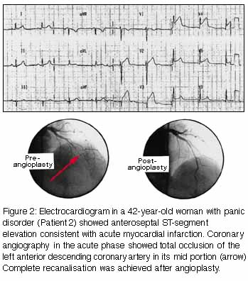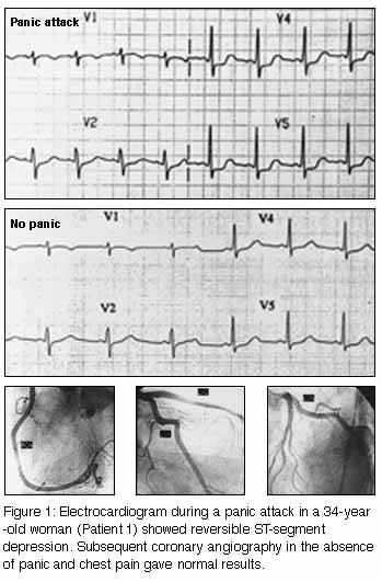 Thus, although panic disorder is distressing and disabling, it has not been thought life-threatening. However, recent well conducted, prospective epidemiological studies show substantially increased risk of myocardial infarction and sudden death in patients with panic disorder (three- to six-fold increase).2,3 These patients sit at the crossroads of cardiology and neuropsychiatry, and provide a clinical model for investigation of the relationship between stress and heart disease. The mechanism by which cardiac risk is increased in panic disorder is not known, but has been thought to involve activation of the sympathetic nerves of the heart, predisposing to ventricular arrhythmias. We present three patients with panic disorder and chest pain whose cases suggest coronary artery spasm as a pos sible mechanism. |