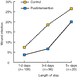 Multivariate analysis using logistic regression found that the only variables significantly predictive of having a wound infection were being in the control group, length of stay (Figure 2) and the patient having a carer (a proxy for functional dependence).
