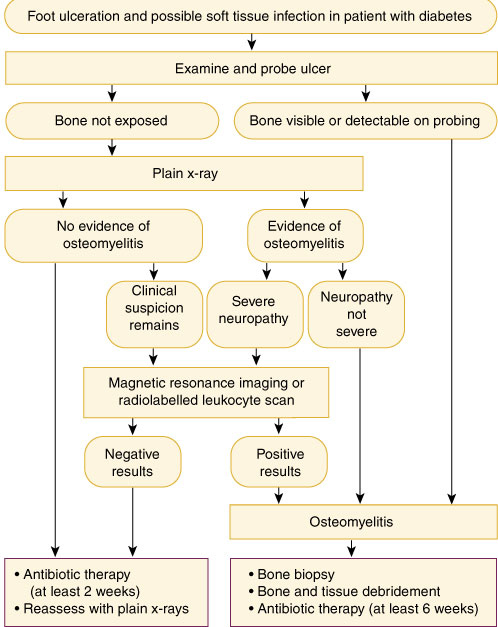 About 15% of people with diabetes mellitus develop foot ulceration,27 which is complicated by osteomyelitis in two-thirds of cases.28 Foot infection is a leading cause of hospital admission in people with diabetes and a major cause of lower-extremity amputation. Factors that increase the risk of osteomyelitis are: