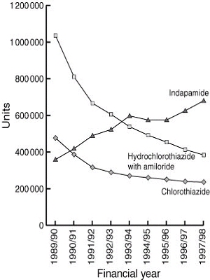 Usage data were obtained for the three diuretics (Mr Peter McManus, Pharmaceutical Benefits Branch, personal communication) by a method in which Pharmaceutical Benefits Scheme (PBS) data and results of a survey of pharmacies are combined.6 Box 2 shows that, for the financial years 1989/90 to 1997/98, use of indapamide increased at a time when use of the other two drugs decreased markedly.