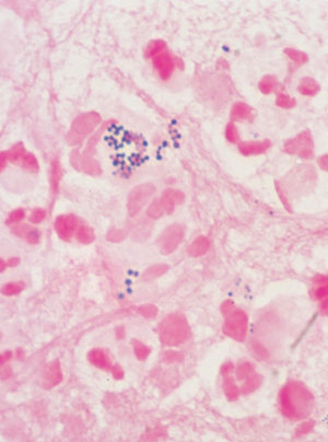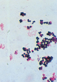 ![]() Swab of pus, showing white blood cells and gram-positive cocci in clumps typical of staphylococci (Gram stain; original magnification, x 1000). |