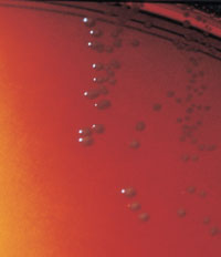 ←Vancomycin-resistant enterococci (VRE): This organism was first described in Australia in 1994. In some countries, it has spread rapidly to many hospitals, especially intensive care and renal units. In most situations, enterococcus has low virulence, but it can be a significant pathogen, especially in debilitated or immunocompromised patients. Some VRE strains are untreatable with currently available antibiotics. Image: Enterococcal colonies on bile–aesculin agar; black colour change is due to aesculin hydrolysis. Vancomycin-intermediate Staphylococcus aureus (VISA): The appearance of S. aureus with reduced susceptibility to vancomycin in Japan, the United States, Europe8 and now Australia9 is a recent, frightening development. Image: Gram stain of staphylococci (original magnification, x 400). → |