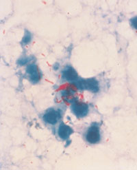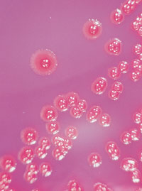 ←Multiply antibiotic-resistant gram-negative organisms: These include Acinetobacter spp., Enterobacter spp. and Klebsiella pneumoniae with extended-spectrum β-lactamases (ESBLs). These organisms give rise to both endemic and epidemic hospital-acquired infections. Many are resistant not only to the newer third-generation cephalosporins, but also to other classes of antibiotics. Recently, there have been outbreaks of antimicrobial-resistant Acinetobacter spp. in Australian intensive care units.6,7 Image: Colonies of a gram-negative rod on MacConkey's agar. Multidrug-resistant Mycobacterium tuberculosis: The worldwide resurgence of tuberculosis, caused in part by the increasing incidence of multidrug-resistant M. tuberculosis, has included hospital outbreaks affecting both patients and healthcare workers. Image: Acid-fast stain of sputum with M. tuberculosis cells stained red (original magnification, x 400).→ |