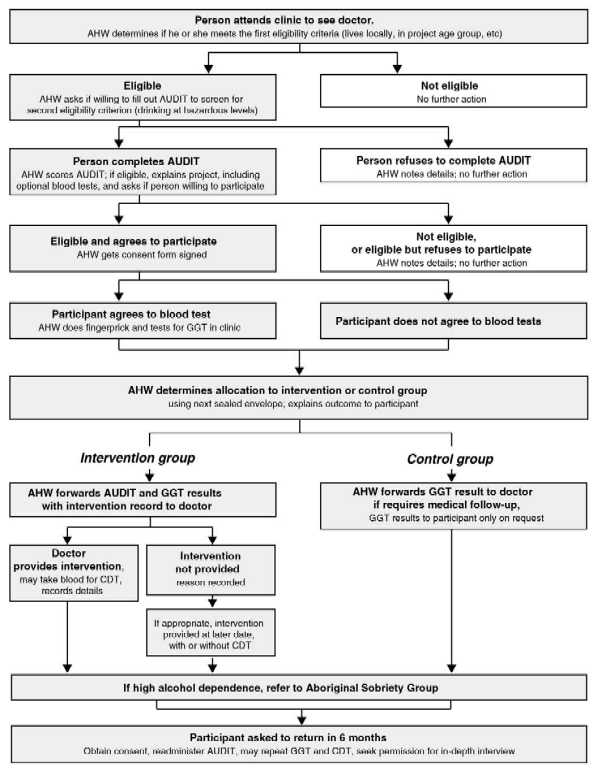 The project protocol was revised several times before it was felt to be adequate. However, it remained extremely complicated (see Box 1), particularly in the context of a busy health clinic. It involved Aboriginal health workers approaching clients, administering the AUDIT, scoring the responses to determine whether clients were drinking at hazardous or harmful levels, tagging the client's file, seeking participation, obtaining informed consent, undertaking the fingerprick GGT test, and completing the randomisation procedures. GPs were responsible for conducting the brief intervention, collecting some additional information, and taking the blood sample for CDT testing. In addition, the project officer had to develop methods for determining potential eligibility for the project and keeping track of clients and their data as they moved through the project, the latter made more complicated by the number of staff involved.