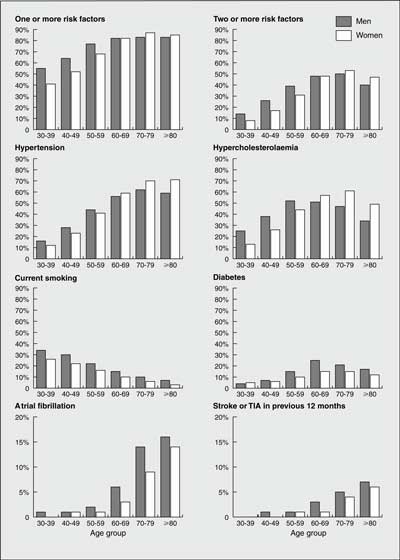 Seventy per cent of patients (74% of men; 67% of women) had one or more risk factors and 34% (37% of men; 33% of women) had two or more. Overall prevalence of risk factors increased with age. The prevalence of individual risk factors is given in Box 2 and the prevalence by age groups in Box 3. Hypertension and hypercholesterolaemia were most common. Within the past 12 months, 2% of patients had suffered a stroke or TIA; however, 3% had any history of stroke and 4% had any history of TIA.