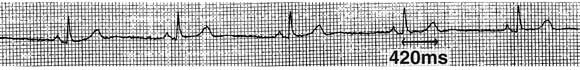 The term "torsade de pointes" describes polymorphic ventricular tachycardia where the QRS axis appears to be twisting around a baseline. It is associated with prolongation of the QT interval, usually greater than 500 ms (normal is less than 440 ms). A pattern of long–short cycle length in the beats immediately before tachycardia is typical of torsade de pointes (Box 3). It is only possible to diagnose probable "torsade de pointes" in our case, as the defibrillator placed in the patient recorded only a brief snapshot after the device had made the diagnosis of a treatable arryhthmia, so the initiating beats were not recorded. Further, the tracing that the device makes is a ventricular electrocardiogram without any atrial tracing, and the intracardiac QT is not generally accepted as a valid measure of the QT interval. However, the rate of the arrhythmia and its twisting morphology, together with the previous brief episode of prolonged QT interval, make any other diagnosis unlikely.