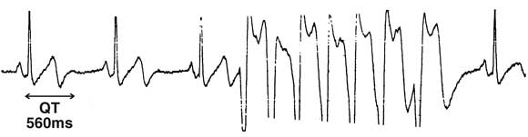 (b) ECG monitor strip showing QT prolongation (560 ms) and a run of non-sustained ventricular tachycardia (arrow).