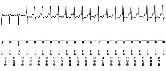 VS = ventricular sensed beat; FS = ventricular beat within the fibrillation zone. Numbers at the bottom denote the tachycardia cycle length in milliseconds.