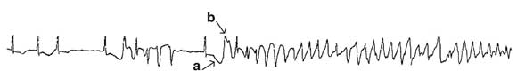 1: Electrocardiograms from the patient before (a) and after (b) implantation of an automatic implantable defibrillator