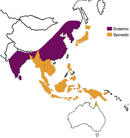 The global importance of JE is significant, with about 50 000 cases and 15 000 deaths a year worldwide.21 It occurs across eastern and southern Asia and the Pacific rim (Box 5). It is transmitted between animals by Culex mosquitoes, with an enzootic cycle involving wild and domestic birds and animals, particularly pigs. Humans are infected as accidental hosts, and, as human viraemia is usually brief and of low concentration, rarely transmit the virus. The ratio of symptomatic to asymptomatic infection is estimated to be between 1: 25 and 1: 1000.22 Two epidemiological patterns are recognised: 23 epidemics occur during the summer in northern areas (eg, northern Vietnam, northern Thailand, Korea, Japan, Taiwan, China, Nepal and northern India), whereas the disease tends to be endemic throughout the year in southern areas (southern Vietnam, southern Thailand, Indonesia, Malaysia, the Philippines, Sri Lanka and southern India).