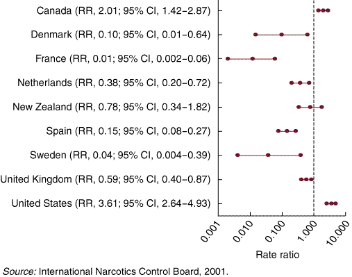 1: Rate ratios (RR) of total licit psychostimulant consumption in Australia (1.0) compared with nine other countries for 1994–2000