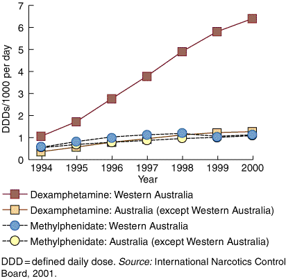 Since 1990, increasingly high rates of psychostimulant prescribing to children and of doctors' consultations for ADHD have been reported in the United States and Australia.1,3,7-10 Because of its PBS listing and longer half-life, use of dexamphetamine outgrew the use of methylphenidate.11 Prescribing of these drugs in Australia is controlled by a few specialists.12
