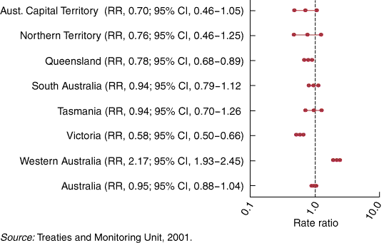 The relative risks (RRs) were calculated for each country in the international comparison and for each jurisdiction in Australia. In the international analysis, Australia was attributed a rate ratio of 1.0. In the national analysis, New South Wales was assigned a rate ratio of 1.0.