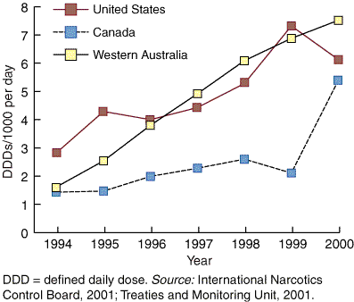 From 1994 to 2000, the patterns of psychostimulant consumption differed markedly between Australia and other countries. In 1994, for example, the methylphenidate to total psychostimulant consumption was 86% for the US, 94% for Canada and 38% for Australia. In 2000, this declined to 59% in the US and 84% in Canada, and was 42% in Australia.