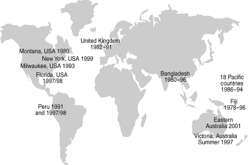 Some health effects related to El Niño are shown in Box 1. Notable effects include epidemics of cholera in Peru12 and Bangladesh,15 increased diarrhoeal illness in Peru13 and widespread faecal contamination of seafoods in Florida.8