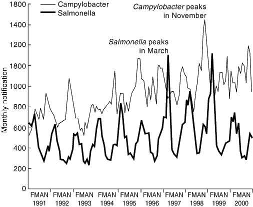 2: Total monthly notifications of Salmonella and Campylobacter infections in Australia, 1991–200020