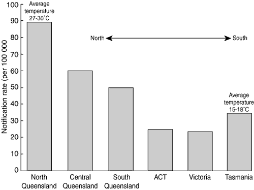 In eastern Australia, rates of Salmonella notifications increase with decreasing latitude and consequently with increasing average yearly temperature (Box 3). Even allowing for confounding factors, such as regional variation in environmental conditions, populations, serovars and routes of transmission, the pattern suggests that climate is a possible influence on the level of salmonellosis in eastern Australia. The higher rates in Tasmania could be due to Salmonella Mississippi, an endemic serogroup found predominantly in that State. This serovar may have a higher transmission rate directly from the environment than from food.