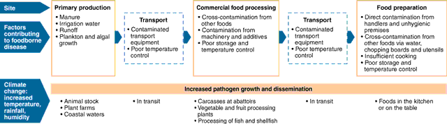 Poor hygiene and temperature control during food production, processing, transport, preparation or storage may interact with climate change, allowing pathogens to multiply (Box 4). The most commonly identified or suspected food vehicles reported in food-related outbreaks in Australia are poultry, red meat, fish, shellfish and salad.5 Some new pathogens have emerged due to changed food production conditions which favour proliferation of some pathogens rather than others (eg, Salmonella spp.), while others have become recognised with new identification techniques (eg, toxigenic E. coli).