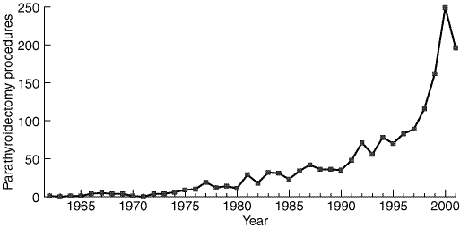 We reported previously that the number of patients referred for parathyroidectomy had "increased virtually exponentially" over the past three decades. This trend has continued, with the predicted annual caseload of parathyroidectomies for 2002 exceeding by three times the number performed only three years ago.7,8