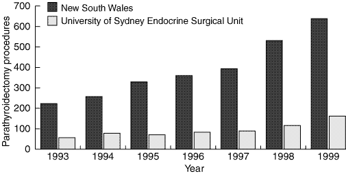 Conclusions: The rate of parathyroidectomy procedures has increased markedly in Northern Sydney and in NSW. The investigation of osteoporosis has led to the diagnosis of primary hyperparathyroidism in an increasing proportion of cases and has contributed to the growing surgical referral rates.