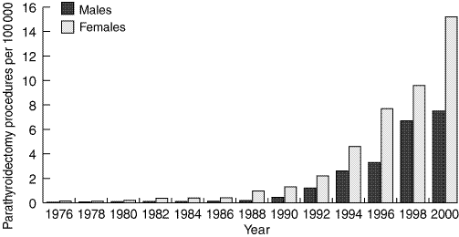 Results: The age-standardised rates of parathyroidectomy for primary hyperparathyroidism in women have increased significantly in Northern Sydney from 0.14 cases per 100 000 in 1976 to 7.7 cases per 100 000 in 1996 (P < 0.001). In NSW there has been an increase in parathyroidectomy rates in women from 5.1 cases per 100 000 in 1993 to 12.3 cases per 100 000 in 1998 (P < 0.001). Osteoporosis was the most common overall indication for surgery in Northern Sydney, accounting for 27% of all cases. The proportion of cases presenting with osteoporosis increased significantly from 4% in 1962–1980 to 34% over the past decade (P < 0.001).