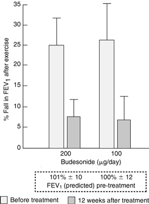 The mean (SD) fall in forced expiratory volume in one second (FEV1), expressed as a percentage of the pre-exercise value, after six minutes of running on a treadmill, before and 12 weeks after treatment with one dose daily of budesonide. There were 14 different children with exercise-induced asthma in each treatment group. The FEV1 measured before the start of treatment showed good lung function. (From Jonasson G, Carlsen KH, Hultquist C.7 Reproduced with permission from Blackwell Publishing.)