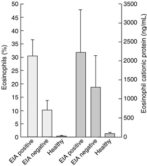 The inflammatory cells most likely to be important in EIA are mast cells and eosinophils. The mediators potentially released by these cells include histamine, leukotrienes and prostaglandins. EIA is most commonly associated with positive skin tests and raised IgE levels.