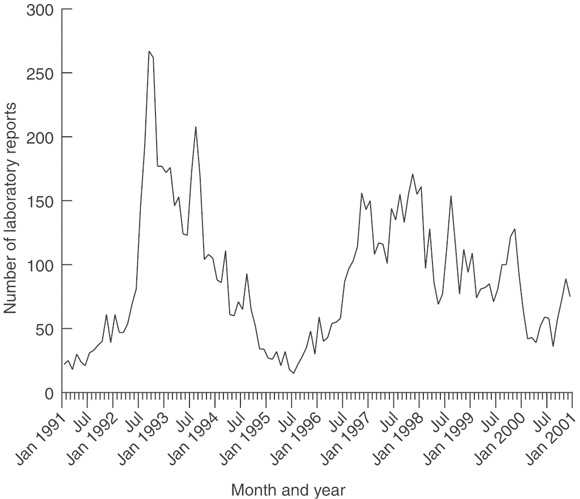 Mycoplasma pneumoniae classically causes dry cough and fever in school-aged children (≥ 5 years old).14 Wheeze is not a classical symptom of Mycoplasma infection, although it may occur, and Mycoplasma is an uncommon cause of exacerbations of asthma.1,15 M. pneumoniae occurs in outbreaks every three to five years, and is relatively uncommon between these epidemics (see Box).14