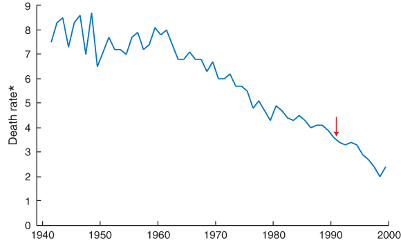 Cervical screening has been available for Australian women since the 1960s.1 The arrow shows when the organised approach to cervical screening commenced (1991). (Redrawn from: Australian Institute of Health and Welfare. Australian long term trends in mortality. Canberra: AIHW, 2002.)