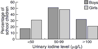 Use of logistic regression showed that the odds of a girl having iodine deficiency (urinary iodine level < 50 μg/L) was 2.5 times greater (95% CI, 1.57–4.12) than for a boy, adjusted for school year. Repeat of this analysis for urinary iodine values < 100 μg/L gave odds of 1.9 (95% CI, 1.2–3.0) for girls compared with boys when adjusted for school year.