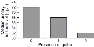 Our study design is based on WHO recommendations that at least two modes of surveillance should be used and a large study sample targeted.25 Urinary iodine levels reflect dietary iodine intake, as 90% of ingested iodine is eventually excreted in the urine. WHO guidelines recommend use of spot urinary specimens to provide an adequate assessment of a population's iodine status.25 Thyroid gland palpation is a quick, easy and acceptable method to assess the presence of goitre. All subjects were assessed by two trained clinicians to reduce the incidence of interobserver bias, which has been reported in previous studies to affect 16%–40% of assessments.26,27