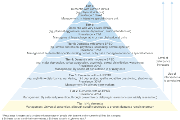 We propose a seven-tiered model of service delivery based on severity and prevalence of BPSD, ranging from no dementia through tiers of increasingly severe behavioural disturbance to the propensity for extreme violence in a small number of individuals.