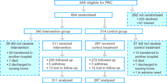 Patients were randomly allocated to the intervention (PAC) or control group by computer-generated numbers. These were provided in sequentially numbered, sealed envelopes which were opened after baseline interviews.