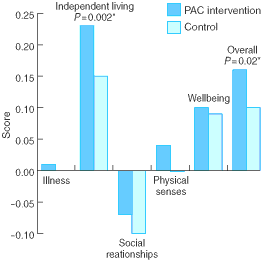 All patients completed the AQoL at baseline, and 540 completed it at one-month follow-up. At baseline, there was no difference in quality-of-life scores between the two groups, except in independent living, where the PAC group had a lower mean baseline score than the control group (0.4 v 0.45 on a scale of 0–1, with a higher score representing better quality of life; P = 0.02). However, the groups differed significantly in changes in scores between baseline and one-month follow-up (Box 4). The PAC group had significantly greater improvements in independent living (P = 0.002) and overall quality-of-life scores (P = 0.02).