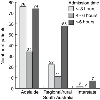 Time to admission was calculated using the arrival time routinely logged in emergency department records. Location of the patient at stroke onset was denoted by postcode and categorised as Adelaide, regional–rural South Australia or interstate, and according to the Accessibility/Remoteness Index of Australia (ARIA).6