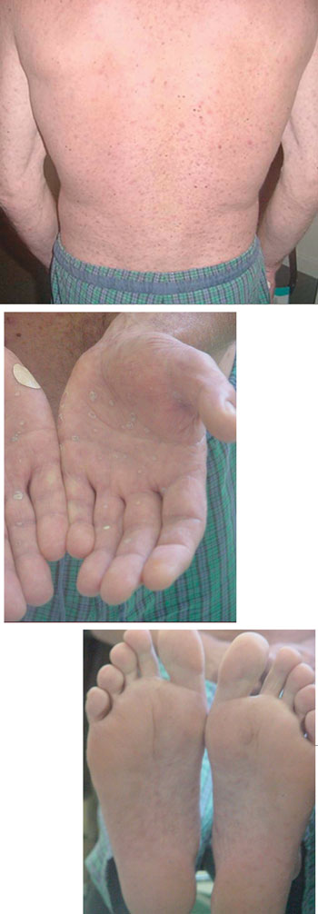 Subsequently, the patient was given 1.5 g procaine penicillin intramuscularly for 14 days. His sexual contacts were unknown. With continued treatment, his plantar rash became desquamating, and a new symmetrical macular rash appeared on his arms and trunk, but not on his palms.