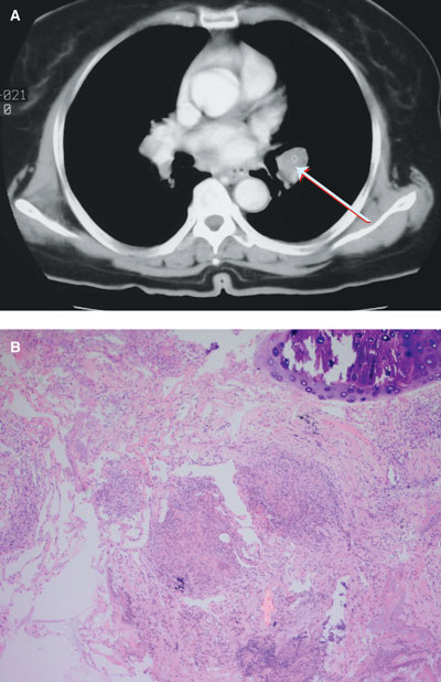 No abnormality was detected on chest x-ray or brain magnetic resonance imaging. However, a computed tomography scan of the chest showed bilateral hilar lymphadenopathy with bilateral basilar lung infiltrates (Box, A). A transbronchial biopsy revealed a single, non-caseating granuloma (Box, B).