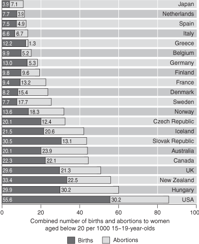 Accurate nationally representative data on teenage pregnancy in Australia, which would be crucial for planning and evaluating prevention programs, are currently unavailable, as most states do not mandate abortion notifications. The reported average national abortion rate in 1997–1999 (based on Medicare claims, which are believed to be an underestimate) was 22 abortions per 1000 teenagers per year, compared with 19 live births.17 This indicates a higher teenage pregnancy rate than many other developed countries, and one of the highest teenage abortion rates in the developed world (see Box).17,18